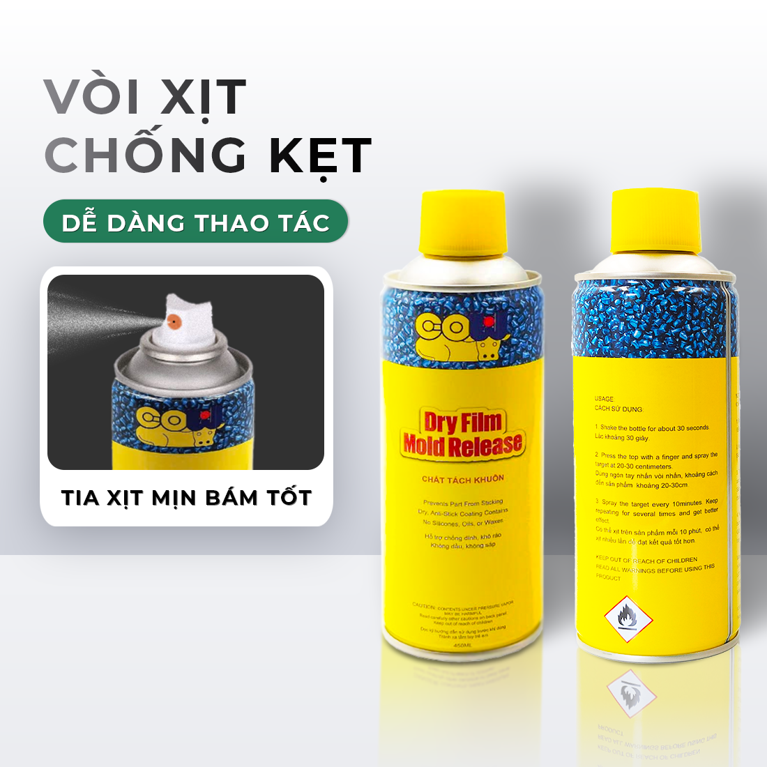 _Lắc đều chai xịt trước khi sử dụng, phun từ khoảng cách 20-30 cm một lớp mỏng, đều lên toàn bộ bề mặt khuôn.